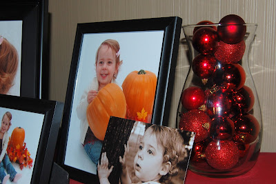 Normally, I fill this large vase with plastic (although very realistic-looking, of course) apples and berries. In my attempt to be a little more festive this year, I dumped out the fruit and dropped (carefully) in some of the red ornaments.